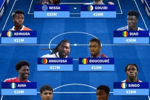 中场:阿迪格拉(科特迪瓦,2200万)、安古伊萨(喀麦隆,2700万)、杜库雷(马里,1500万)、迪奥(塞内加尔,3000万)